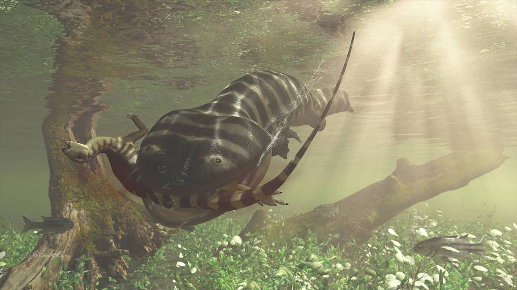 With an estimated size of five meters long, Koolasuchus wasn’t just one of the biggest amphibians ever, it was also the same size as the largest crocodiles alive today! Koolasuchus likely behaved like crocodiles too. The powerful and robust tail would have allowed for short bursts of power, making ambushing prey a probable tactic. The tail, alongside wide jaws lined with dozens of sharp teeth, would have made Koolasuchus a fearsome ambush predator. With such an abundance of small dinosaurs, it isn’t difficult to assume that dinosaurs may have been on the menu.