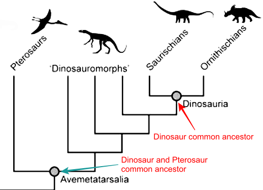 Both dinosaurs and pterosaurs are part of the Archosauria family, a clade of reptiles that includes crocodiles. Dinosaurs and pterosaurs were close relatives within Archosauria; other than birds, pterosaurs were the closest ancestors to dinosaurs. Though the two lineages are close to each other from an evolutionary perspective and do share some biological features, this does not mean the two are synonymous with each other.