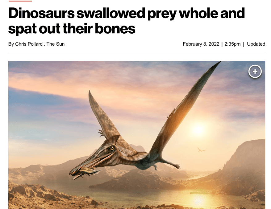 Pollard, Chris. “Dinosaurs Swallowed Prey Whole and Spat out Their Bones.” New York Post, New York Post, 8 Feb. 2022, https://nypost.com/2022/02/08/dinosaurs-swallowed-prey-whole-and-spat-out-their-bones/.