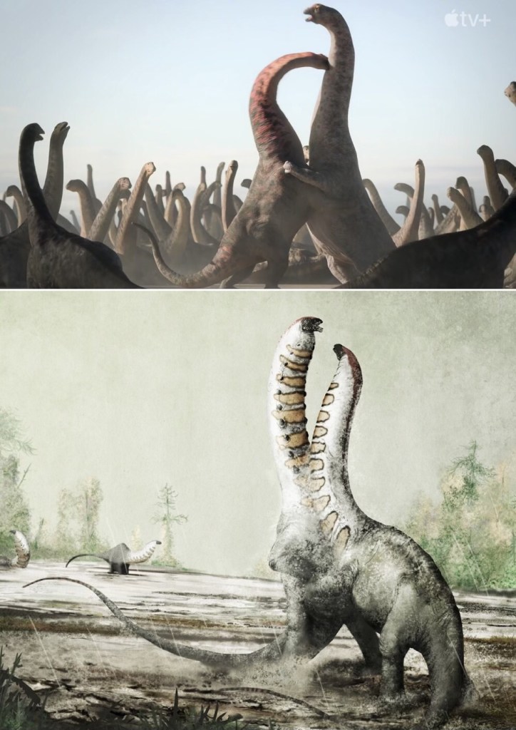 What surprised me was the influence that paleoart had on some of the design choices. The artwork of both Ugueto and Witton is brought to life in some scenes, most notably the clash of sauropods being directly inspired by one of Witton’s pieces: