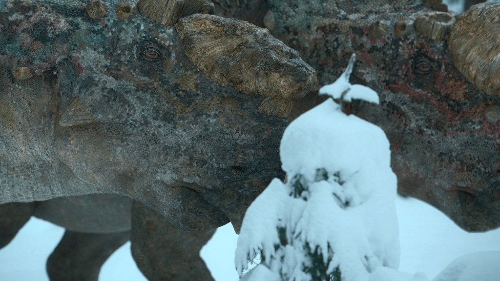 Star of the Episode – Pachyrhinosaurus: A ceratopsian from North America, Pachyrhinosaurus is depicted as a herding animal surviving in the harsh Alaskan winters. Equipped with feathers and a nasal dome instead of a horn, Pachyrhinosaurus is one of the best dinosaurs featured in the series.