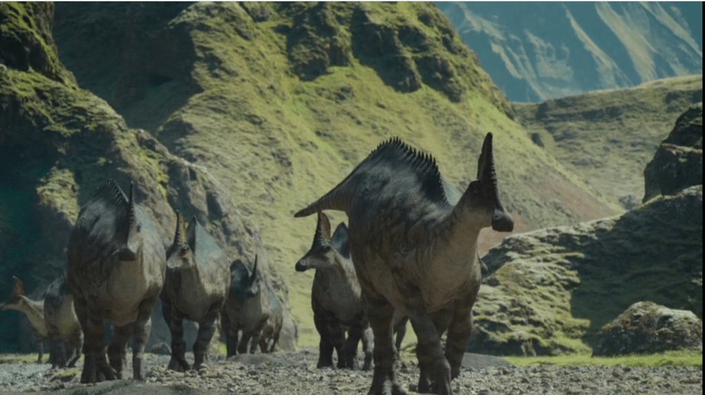 Olorotitan: The only crested hadrosaurid featured in Prehistoric Planet, Olorotitan is shown nesting in the volcanic foothills of Siberia. The perfect paradise of warm soil and horsetails quickly turns sour in the presence of mosquito swarms, though an important lesson is taught: to evade mosquitos, climb a mountain.