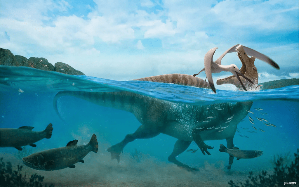 The Weald Clay Formation from Southern England contains similar fauna to Wessex except for Baryonyx, a large Spinosaurid that practised aquatic behaviours. While Spinosaurus didn’t live during the Barremian, Baryonyx would be an excellent stand-in. Both formations have plenty of other prehistoric life to explore too. Mammals and pterosaurs from Wessex are common, while the pliosaurid Leptocleidus of Weald Clay could be used to represent marine life.