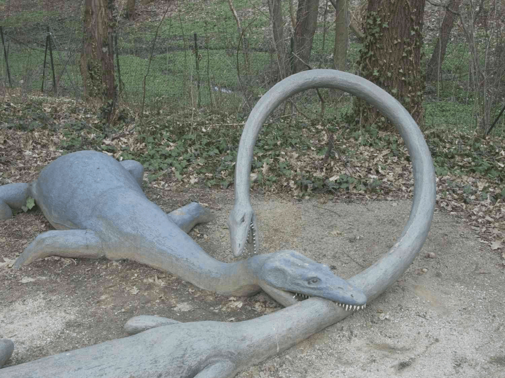 While decades old dinosaur parks don’t typically exemplify accuracy, this display of Tanystropheus (right) and Nothosaurus (left) may be spot on. ©Diether/Wikimedia Commons