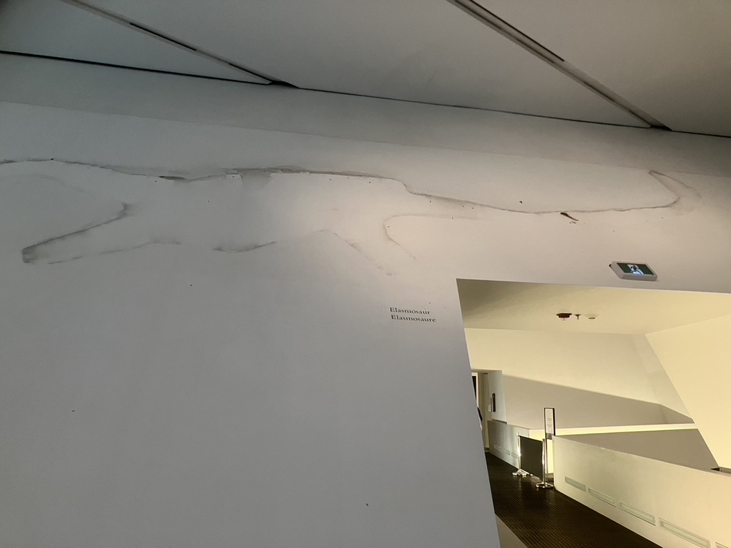 Others are humorous, namely the greasy outline of an Elasmosaurus that shows the difficulty of cleaning structures located 5 meters up: