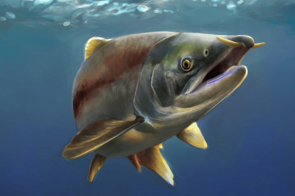 If the thought of a tusked salmon isn’t doing it for you, picture a giant zombie fish at the tail end of spawning, still alive but slowly withering away. Luckily you don’t have to, thanks to the talented work of Hodari Nundu. What a perfect piece to end a prehistoric obituary with!