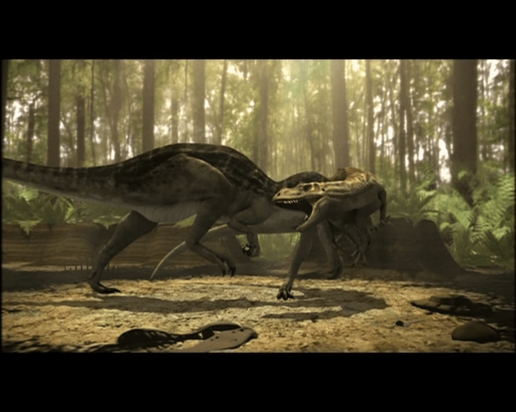 Soon after the Ceratosaurus starts eating the baby Stegosaur, a pack of three Allosaurus arrive on the scene. While two distract the Ceratosaurus, a third individual circles behind and attacks the Ceratosaurus from the side, instantly killing it by ramming into its flank. While I love displays of dinosaur intelligence, even I must concede that it is unlikely that Allosaurus could engage in cooperative hunting strategies. Birds and Crocodilians, the closest living relatives to dinosaurs like Allosaurus, rarely engage in pack hunting. Though predatory dinosaurs (including Allosaurus) have been documented congregating together to scavenge food, the comparatively primitive brain of Allosaurus was incapable of using complex strategic maneuvers to outflank another predator[i]. Even if this did happen, Allosaurus wasn’t a “freight train” as described and couldn’t have killed the Ceratosaurus in one charge. You’d think that Bloodiest Battle would salivate at the chance to show an actual fight between the two theropods, but instead we get a very lopsided squash match. Guess the budget was going a little overboard!