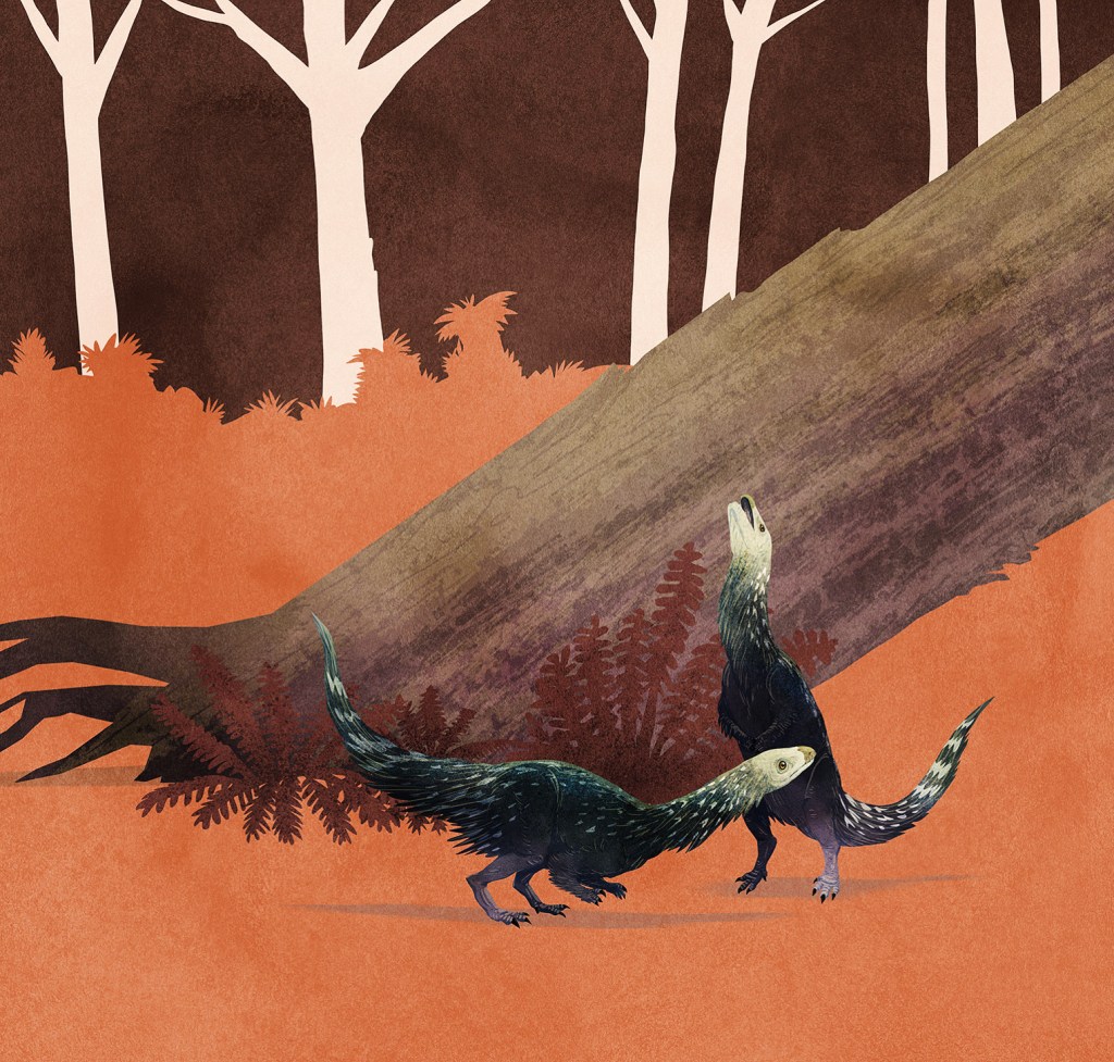 A pair of dancing Xiaotingia, not quite the theropods who made these tracks but still a good analogue! ©7snows on Tumblr.