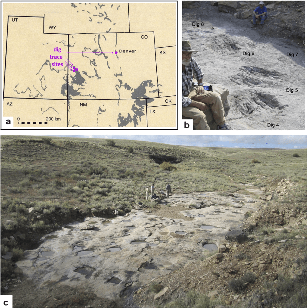 In 2016, paleontologists led by Martin Lockley of the University of Colorado published a study describing several strange markings found in the central United States[i]. The trace fossils, which were made some time during the Late Cretaceous period approximately 100 million years ago, consist of large depressions in the rock often with scratch marks within. Spanning across several sites in Colorado, these imprints were found in high concentrations with multiple sizes preserved, signalling the presence of different individuals at these localities.