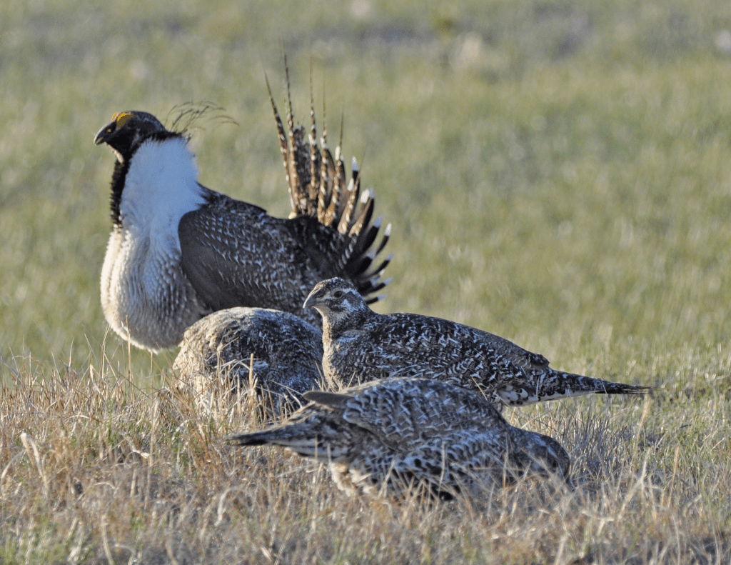 A congregation of a male (background) and several female (foreground) Greater Sage-Grouse, illustrating the high degree of sexual dimorphism in lekking birds. ©Jeannie Stafford & National Park Service